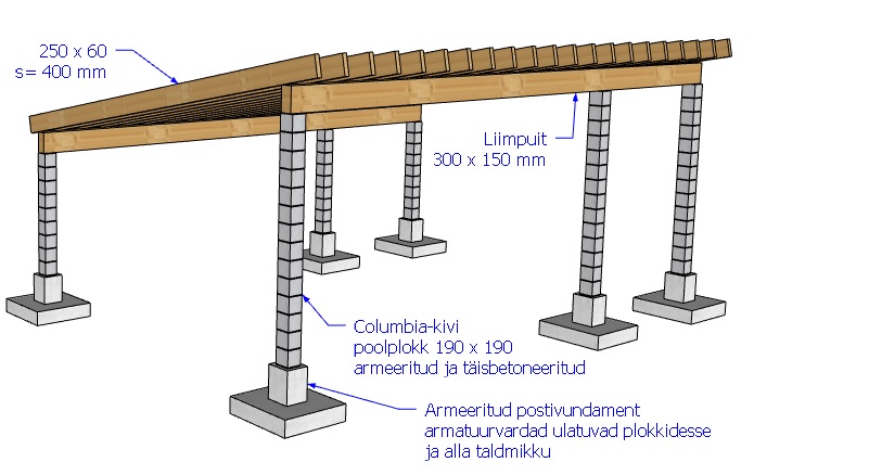 Nokitsesin AutoCAD-is kaks varianti viilkatusega, üks ilma postidega autode alas ja teine postidega. Lisaks paneks ka nn vahelae talad mis hoiaks hoonet koos, need siis toetavad ülemisele vööle ja on ka sarikate küljes kinni. Lisa postidega variandil on ka autode alas vöö talade all.