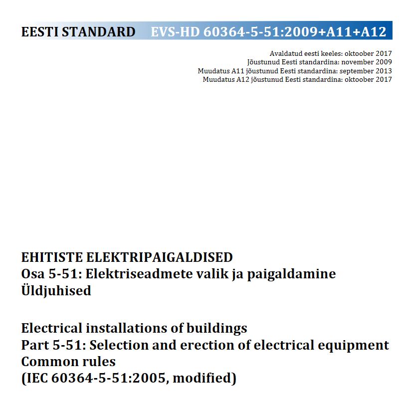 EVS-HD 60364-5-51, EVS-HD 60364-5-52 ja EVS-EN 50565-1 toodud nõudeid. Samuti
