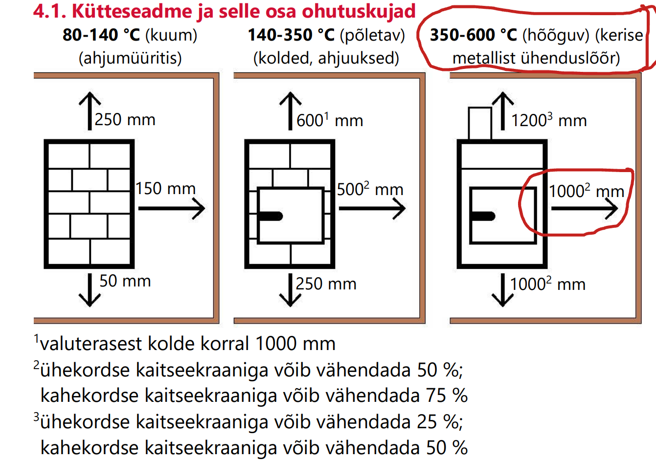 “Ehituslike tuleohutusnõuete kokkuvõte” Päästeamet, 2020, lk 23Tavalugeja kirjutas: 17 Juun 2024, 07:38 Millisest kehtivast kirjatükist leian selged nõuded pliidiplaadi tuleohutuskujale, (eelkõige horisontaalsuunas)?