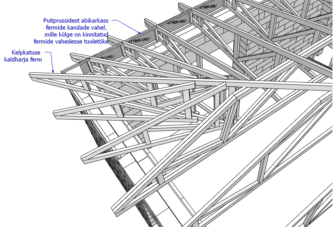 Panen illustratsiooni eesmärgil ühe pildi. Tegemist ühe minu reaalselt ehitamisel olnud objekti kelpkatuse mudelist kopeeritud nurgafermidest. (ma muide olen oma viimase aja ehitusobjektid paralleelselt 3d-mudeldanud arvutisse). Vaadake nüüd hoolega ja mõelge. Kuidas on võimalik sellisesse asukohta villa paigaldada nii, et tegelik U-arv vastab arvutuslikule U-arvule. (sõltub muidugi ka arvutamise oskusest - muide sellise koha U-arvu arvutamine ei ole kindlasti lihtne ülesanne)