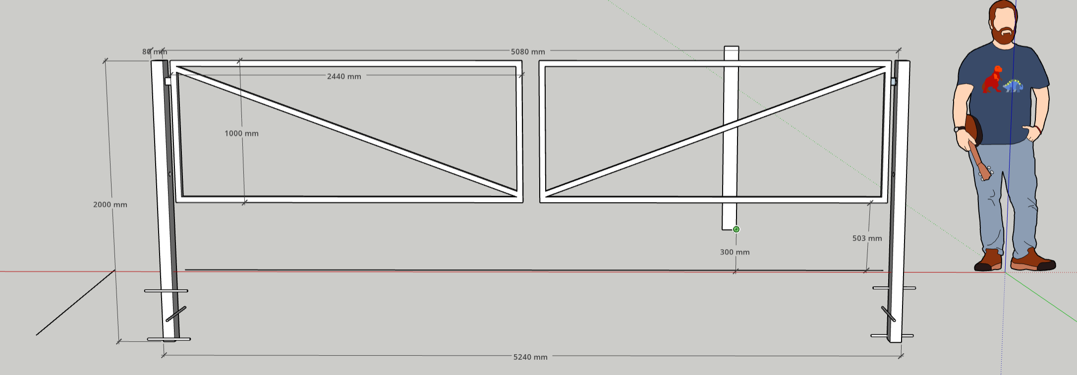 Postid ja väravad on olemas, mõõtmed näha joonisel. Praegu arvestasin tee pinnalt 50cm maasse aga ilmselt saaks veel lisaks 20-30cm allapoole liikuda vajadusel.