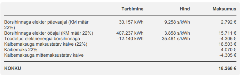 Võrgutasu ja muud maksud ka juurde. Me räägime siin sellest numbrist (€ või s/kWh), kui kogu elektri + võrgutasu arve lõppsumma on jagatud tarbitud energia kogusega.