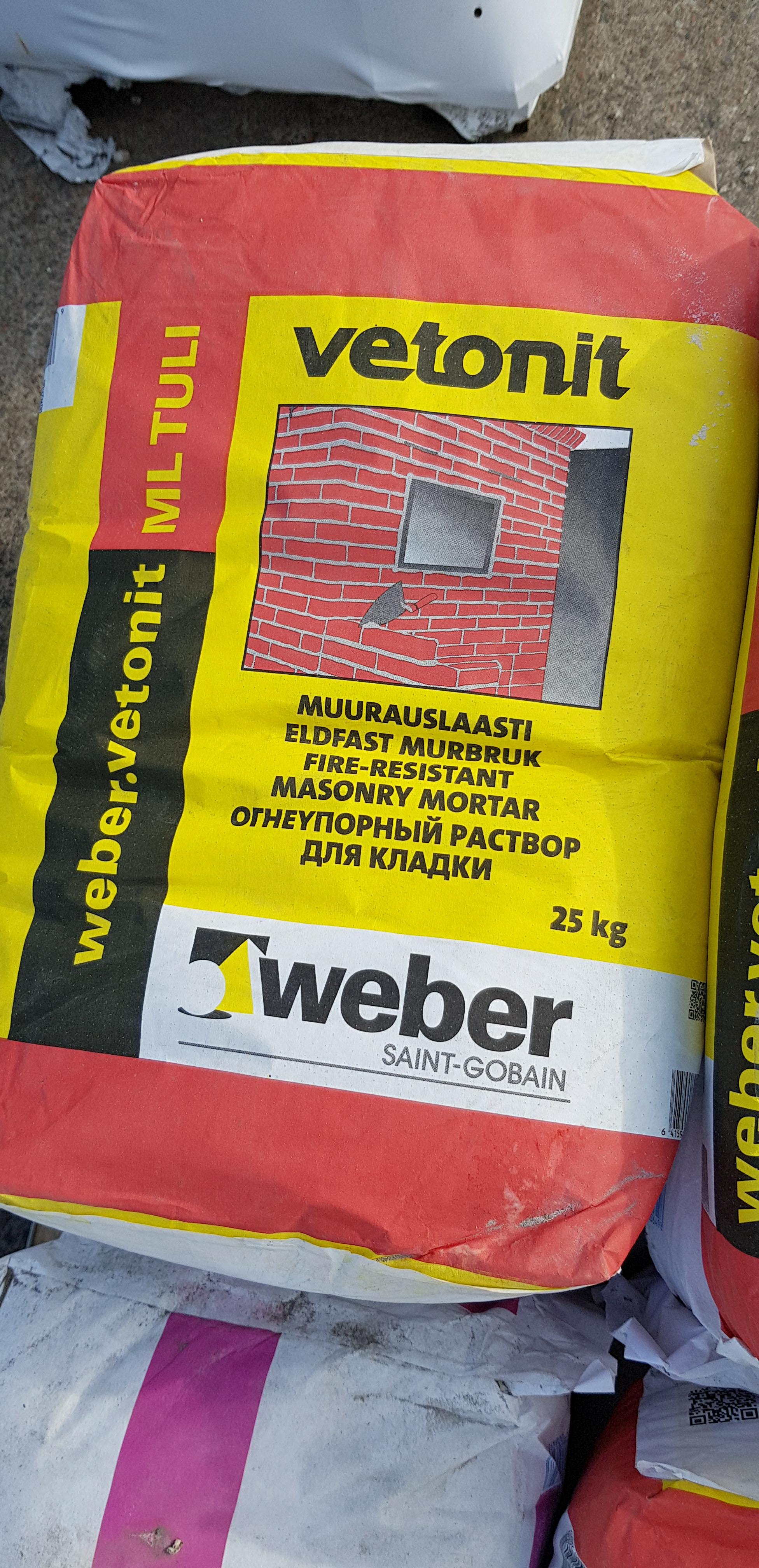3 kotti WEBER VETONIT ML TULI tulekindlat müürisegu 25kg. Komplekti hind 50.- EUR, eraldi ostes 20.- EUR kott.