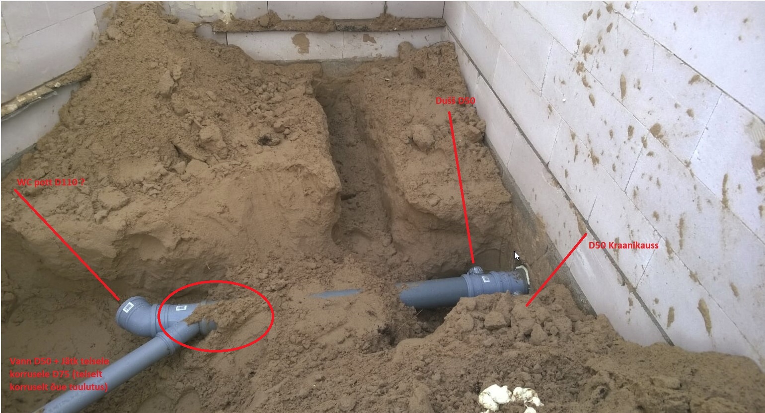 Nimelt siis majal kaks horisontaalset d110 kanaliliini. Majast väljuvas otsas probleemi pole kuna üks liin toimib ilma ummistusteta, seal köök, pesumasin taga.
