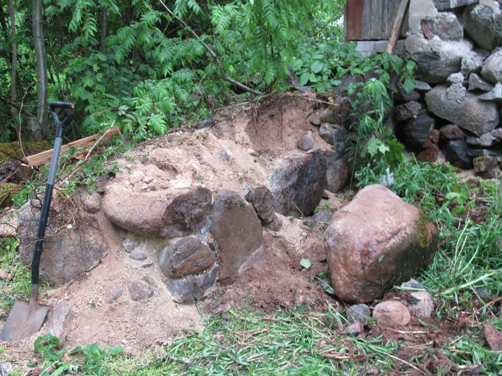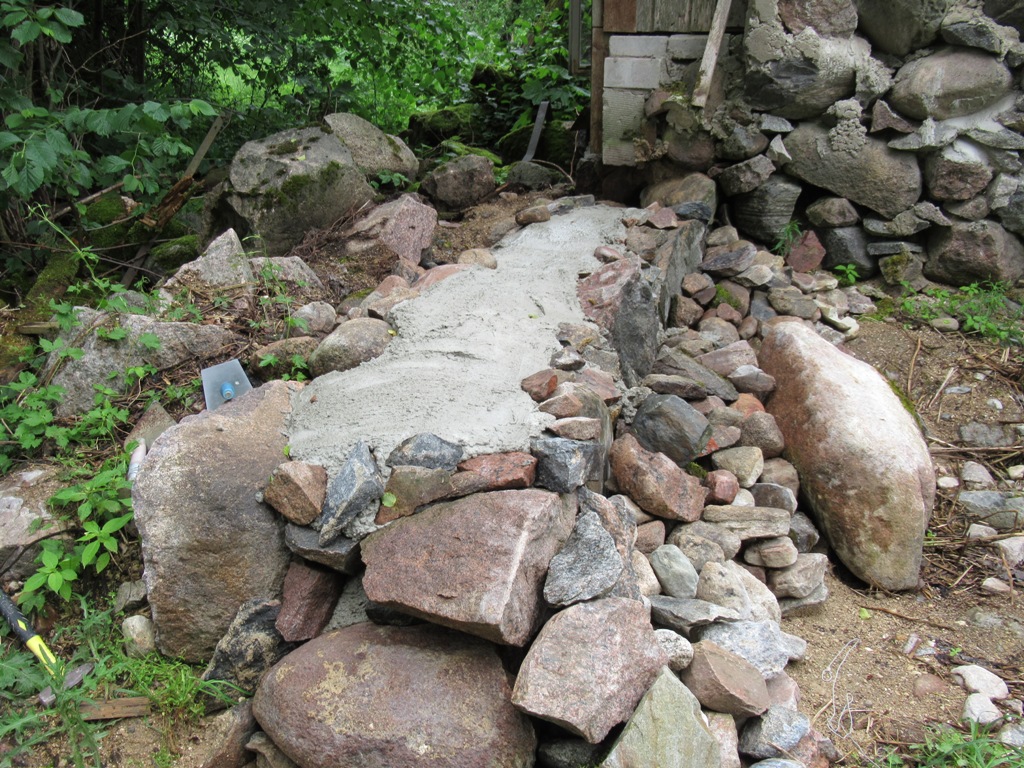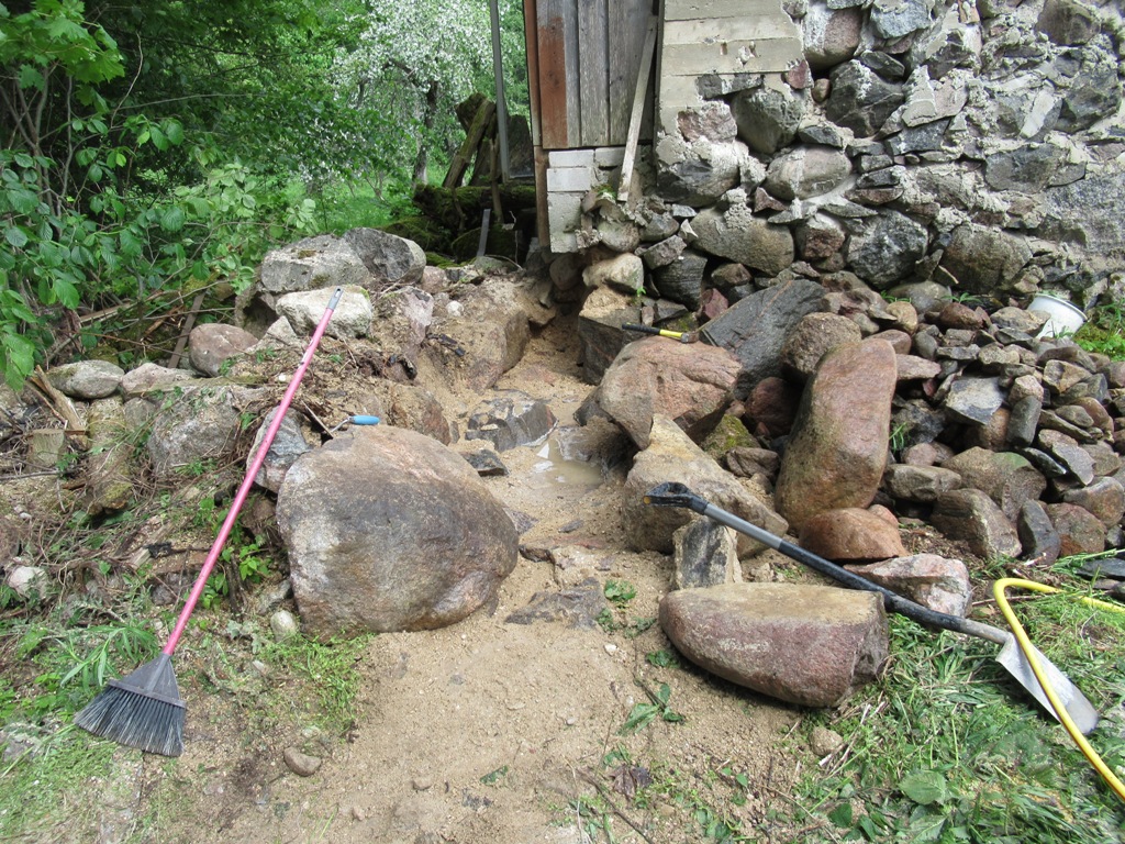 Mõned pildid valust ja vanast müüritisest, mille laiali tõmbasin, kuivalt püsti ladusin ning mille vahele oli pärast ülejäävat betoonisegu hea ära kasutada. Müürist välja tulnud pisemaid kive sai ühelt poolt toestuseks ette laotud, teiselt poolt oli tugi juba varem varisenud kivide näol olemas. Põranda valamise ajal laon sellele müüritisele veel ühe kihi peale ja valan täis.