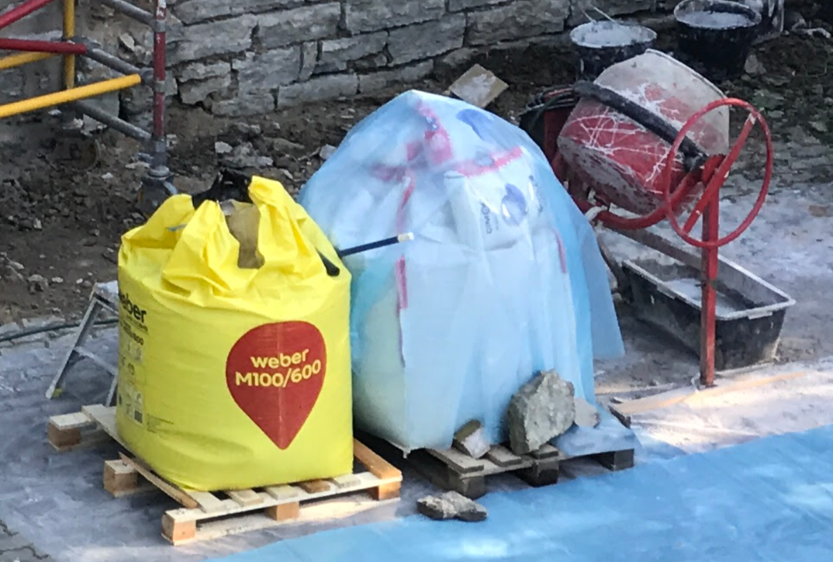 Palun abi, kas keegi igapäevaselt müüritöödega kokkupuutuv asjatundja suudaks nendelt piltidelt välja lugeda, mis tootja ja mis segu parempoolses kilega kaetud puna-must-valgetes 25kg kottides kasutusel võib olla?