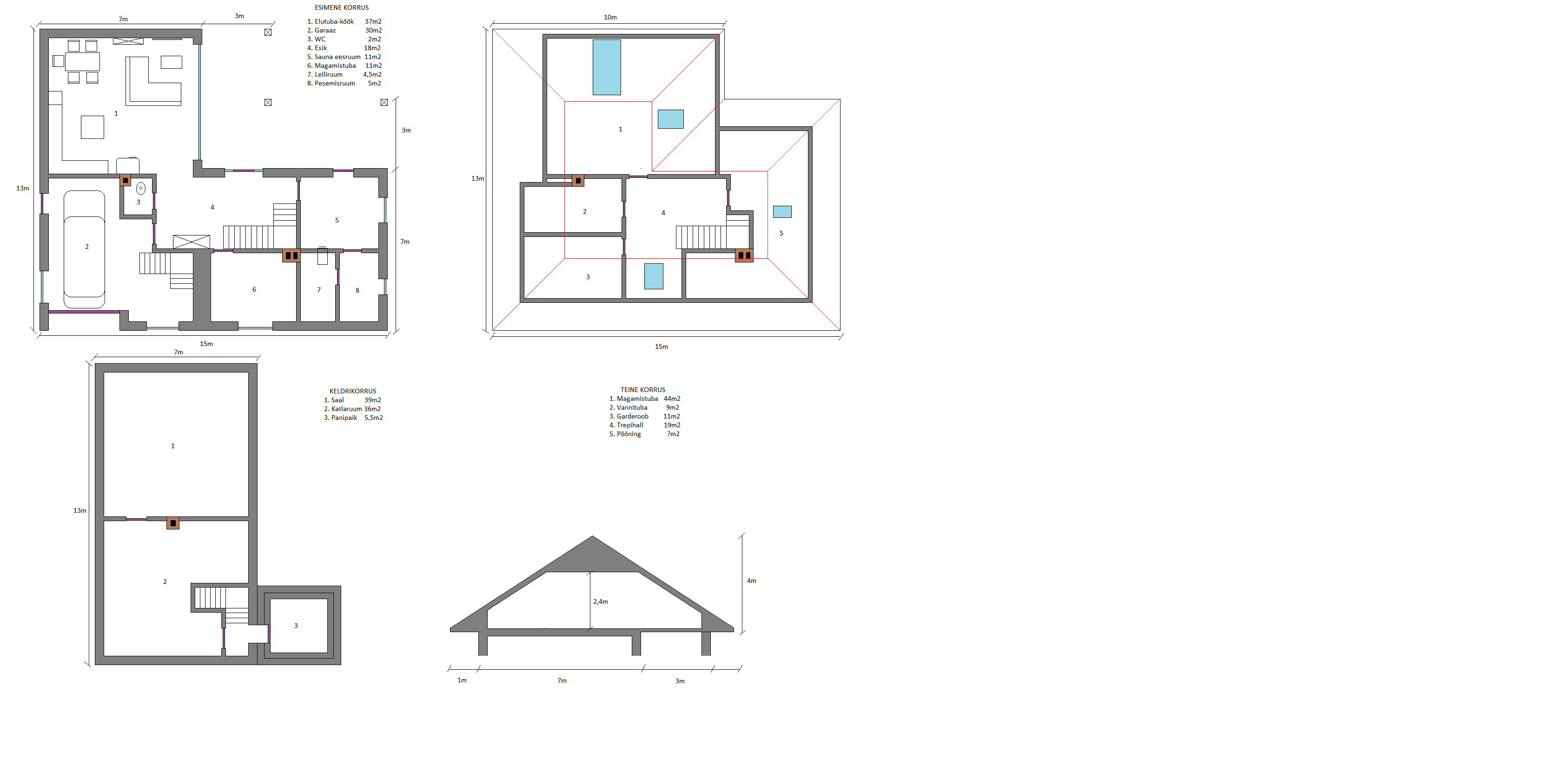 L-kujuline maja siis. Parempoolne tiib on juba olemas (ruumid 4,5,6,7 ja 8 + väike kelder 3), sellel tuleb lihtsalt katus maha võtta ja uus katus tervele majale ehitada + välisviimistlus.