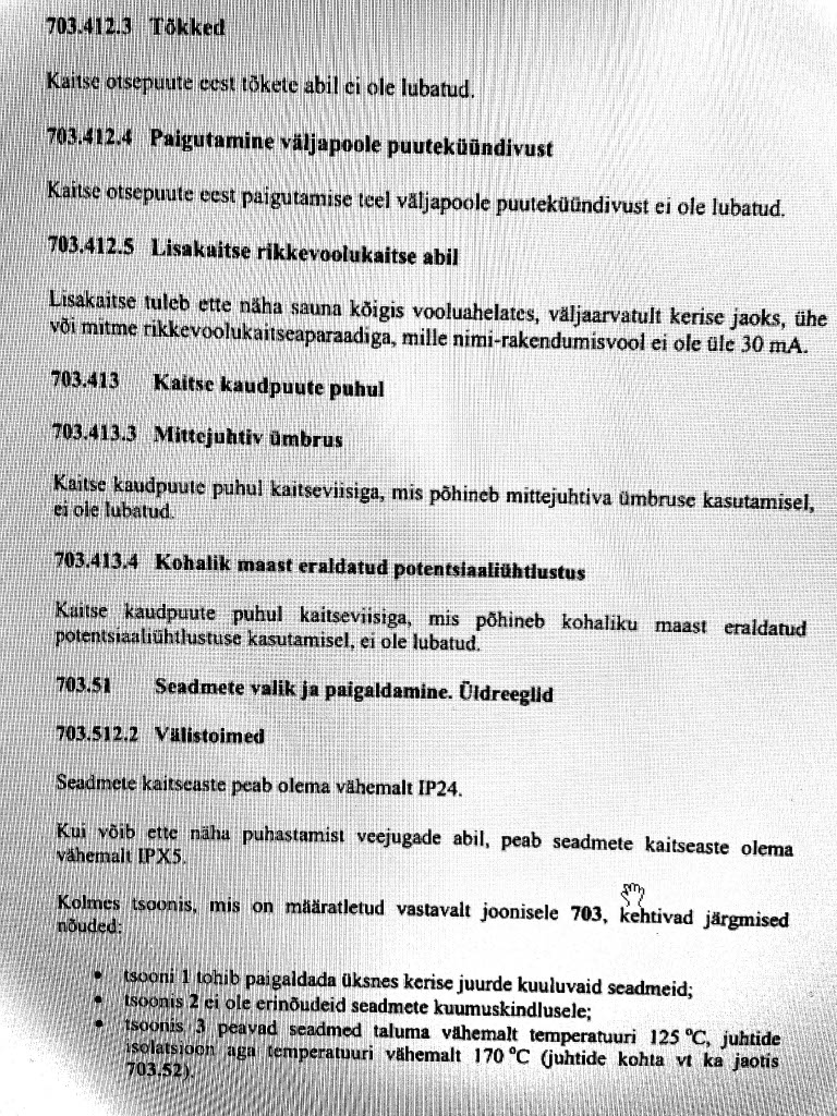 Leiliruumide kohta on teine standard - Ehitiste elektripaigaldised. Osa 7-703: Nõuded eripaigaldistele ja -paikadele. Saunakeriseid sisaldavad ruumid ja kabiinid