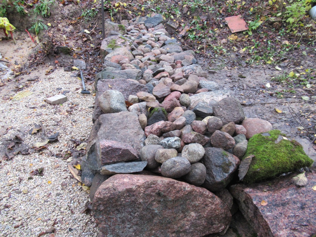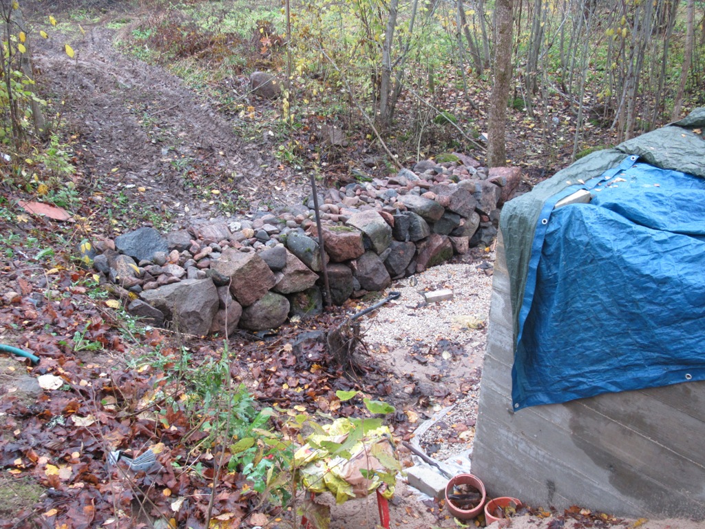 Seal tagapool , kuhu piirdevall maakividest sai laotud, on looduslikult nõgusam koht, kuhu näiteks lumesulamisveed kogunevad ja siis sinna tekib nö looduslik minitiik. Toru otsad on viidud sinna,pildi pealt peaks näha ka olema, aga ma kahtlen, et neis torudes kunagi üldse vesi jooksma hakkab, selleks peab ikka väga kõvasti vihma sadama hakkama või meeletu lumi sulama.Aga kus on proovivõtukaev, äkki mahuti lekib? Kuhu juhite selle drenaaživee? Kohalikku jõkke?