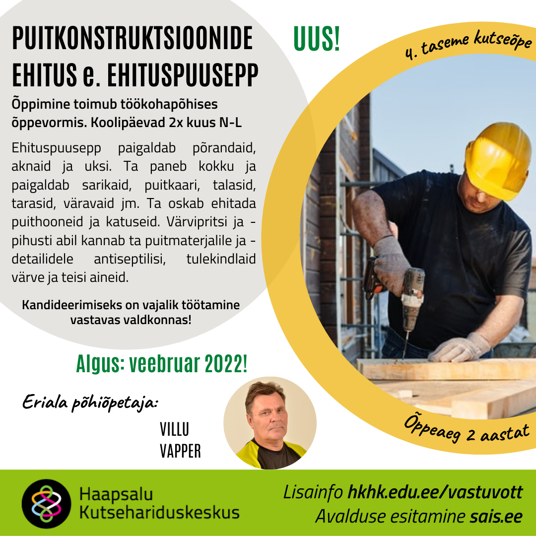 Kui töötad ehitusvaldkonnas ning soovid kahe aasta jooksul õppides omandada väga head teadmised töötamaks ehituspuusepana ja selle tõestuseks pista taskusse ka kutsetunnistus, siis räägi läbi oma tööandjaga ning pane kärmelt oma avaldus teele sais.ee keskkonnas!
