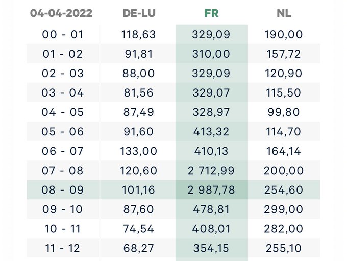 trebla kirjutas: 05 Apr 2022, 21:04 ... Prantslased suutsid eile hommikul tekitada omale rämedad tunnihinnad - 2 712,99 ja 2 987,78 €/MWh.