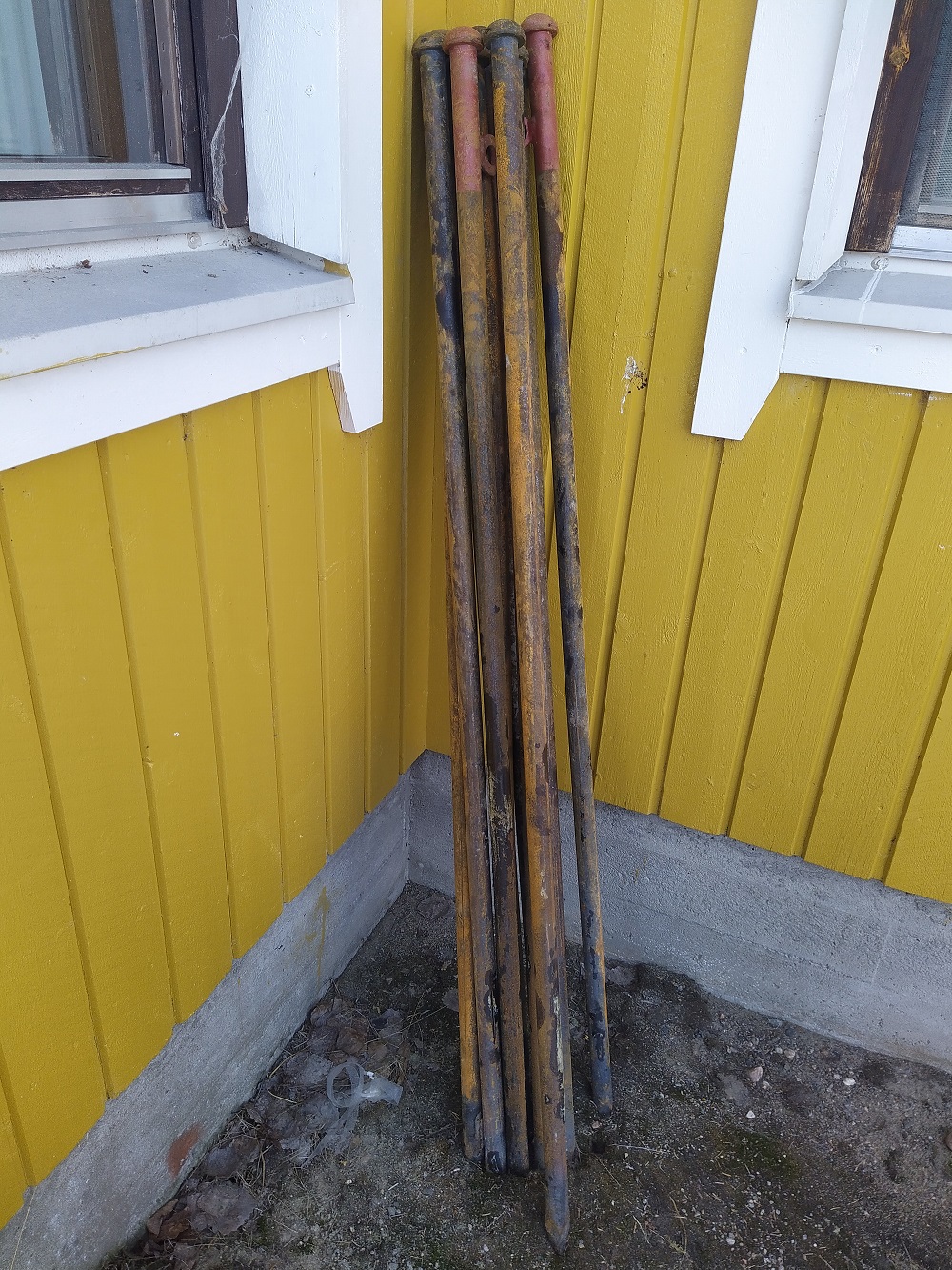 Mõtlesin et puurin augu ette, löön sellise juraka maasse ja korras ongi. Poolteist meetrit pikk ja 4-5cm paks varras. Arvatavasti vaja teine ka otsa keevitada ja taguda kuni läheb.