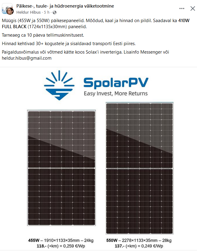Oma tarbeks tootvad ja võrku tootmist piiravad seadmed on juba aastaid olemas ning FB's reklaamib, et Poolast saadavad ca 500eur eest kohe Eesti, Poola laost.