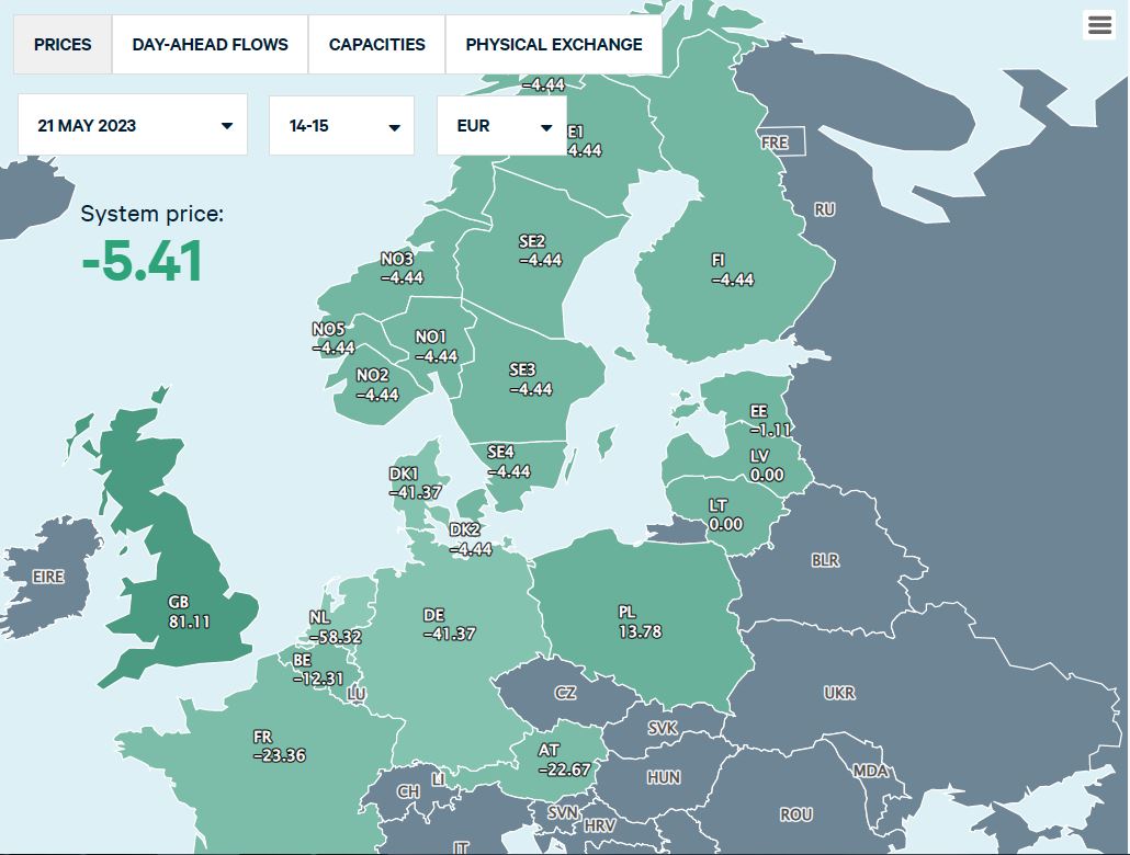Tundub, nagu Eesti ja Läti vaheline ühendus päeval on piiratud ning meil on Soomele lähedane elektrihind. (Näidatakse odavat hinda, et mitte maksta päikseelektri eest.)