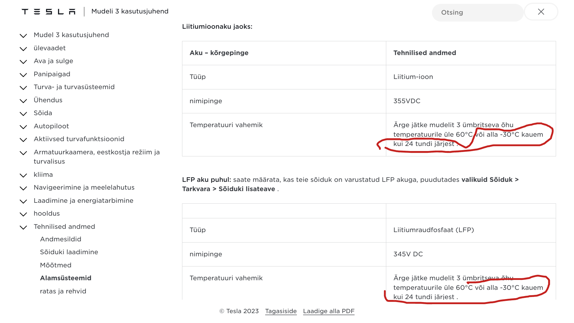 Pole mul aega ega tahtmist midagi otsida aga juhtmisi sattus ette Tesla kasutusjuhend ja näiteks selles on märgitud piirang -30C kohta.