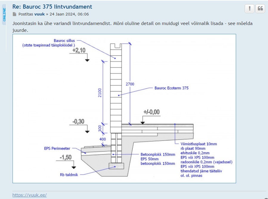 Kuidas seda mitte tekitada, betoonist vundament on ise üks suur külma sild. Selle vundamendi peale on tarvis toetada kas kergplokk või puitkarkass vms. Milline on reaalne riiulist saadav mõistliku hinnaga lahendus, et vundamendi ja seina vahelist külmasilda katkestada.alarpiirfeld kirjutas: 29 Jaan 2024, 09:40 Tere. "kuidas külmasillast lahti saada soojustamata sokli ja vundamendi korral." Kõige lihtsam on seda üldse mitte tekitada. Suur osa Eest projekteerijatest mõtleb vastavalt "ehitustavale". Kas selleks on nende oskamatus ise mitte mõelda või tellija finantssurve pole hetkel teema. Selliste asjade projekteerijad ei viitsi endalt küsida MIKS ON VAJA SOKLIT VÕI VUNDAMENTI SOOJUSTADA. Kohe kui sellele küsimusele suudetakse vastus välja mõelda tuleb iseenesest juba loogiline lahendus. Lugupidamisega. Alar Piirfeld