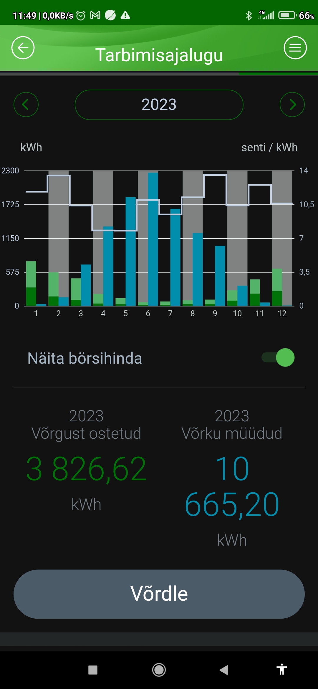 Võrgust ostetud ca 5200kWh ja võrku müüdud ca 6300kWh elektrit.