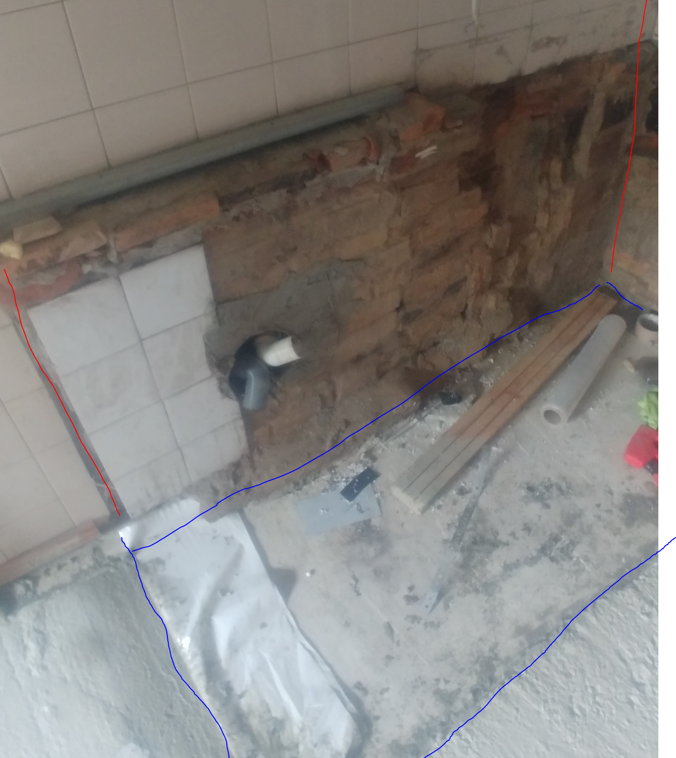 Nimelt seoses põrandakütte paigaldusega sai välja löödud Kalvise pliit mis küttis ka radikaid. Varasemalt on sama koha peal olnud ka Pioneer pliit ja algupäraselt on seal olnud üldse laotud pliit, mis tundub, et oli laotud soojamüüriga ühte. Igatahes avanes pliidi tagant pilt suhteliselt lohakalt laotud tellistest ja osaliselt pudedast savist. Ka müüri alune oli pude, kuid see sai kõik puhastatud ja asemele sai valatud massiivne betoonist taldmik koos armatuuriga, ehk siis see osa on kõik kõva. Küsimus selles, et mida teha selle tellistest vertikaalse soojamüüri osaga. Ülejäänud soe müür on tehtud tegelikult glasuuritud potikividest, mille peale on hiljem kleebitud veel keraamilised plaadid. Kas selle tellistest osa uuesti ladumine on mõeldav? Pelgan seda varianti, sest kardan et midagi võib kaela tulla. Variant oleks lihtsalt paksustpidi sinna midagi tugevduseks juurde laduda/ valada, aga tsemendiga sinna kallale ilmselt minna ei tohiks. Äkki on kellelgi ideid?
