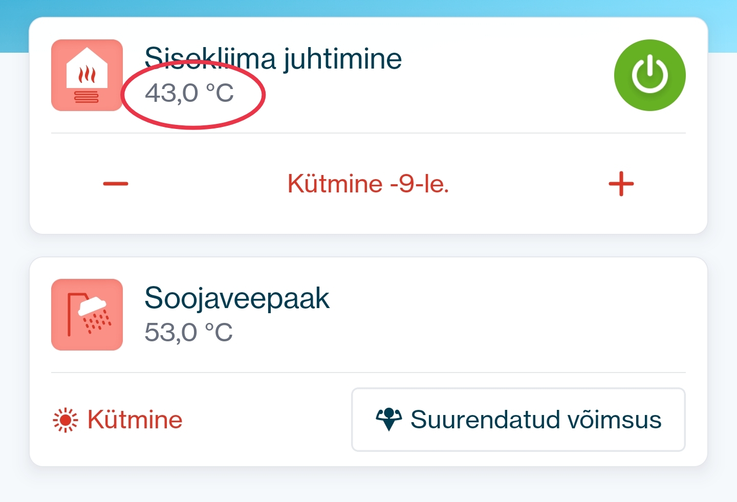 See 43*C pildil näitab väljuva vee temperatuuri, selle põhjal siis nuputasin, et kas -9-lt -10-le ikka tegi tuba jahedamaks, eilse jooksul kõikus 40-42 vahel, praegu näitab, et välja läheb 38, juu siis aitas