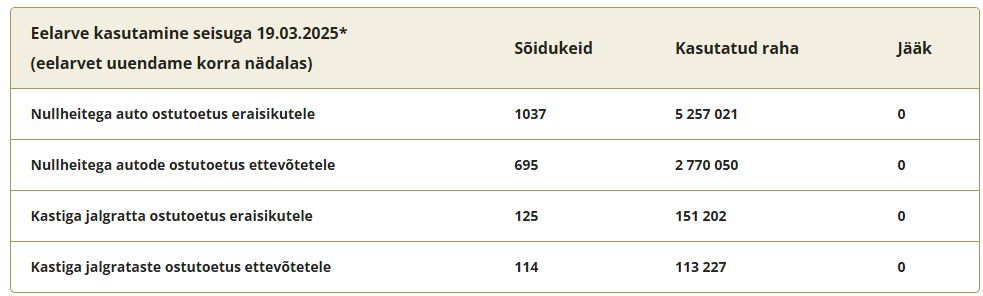 puuduvad täna Eesti Vabariigis. Eriti sellised, mis oleks riigieelarvest rahastatud. Ükski tänane toetus (madalam liisinguinteress jms.) ei tule sinu taskust.