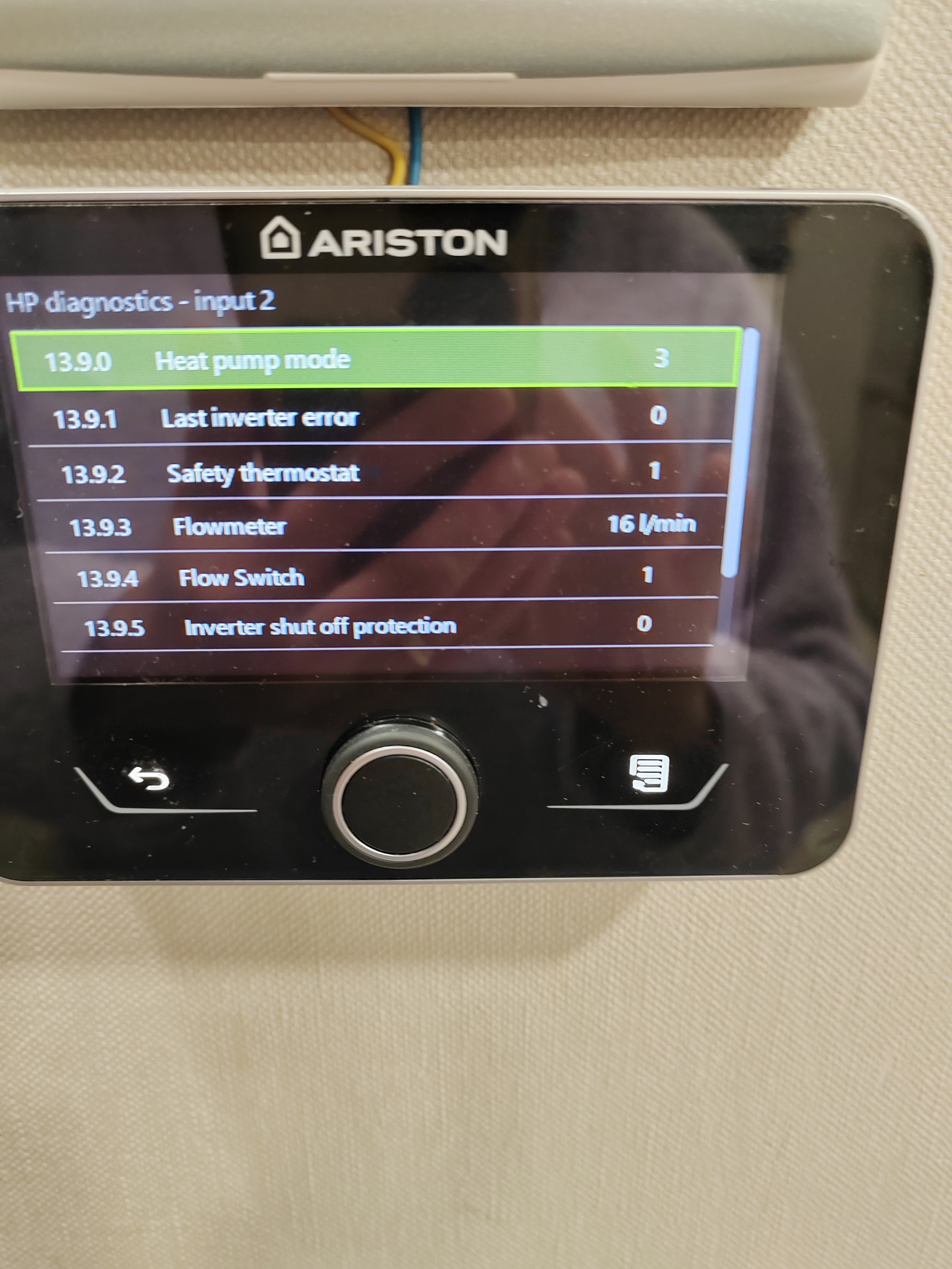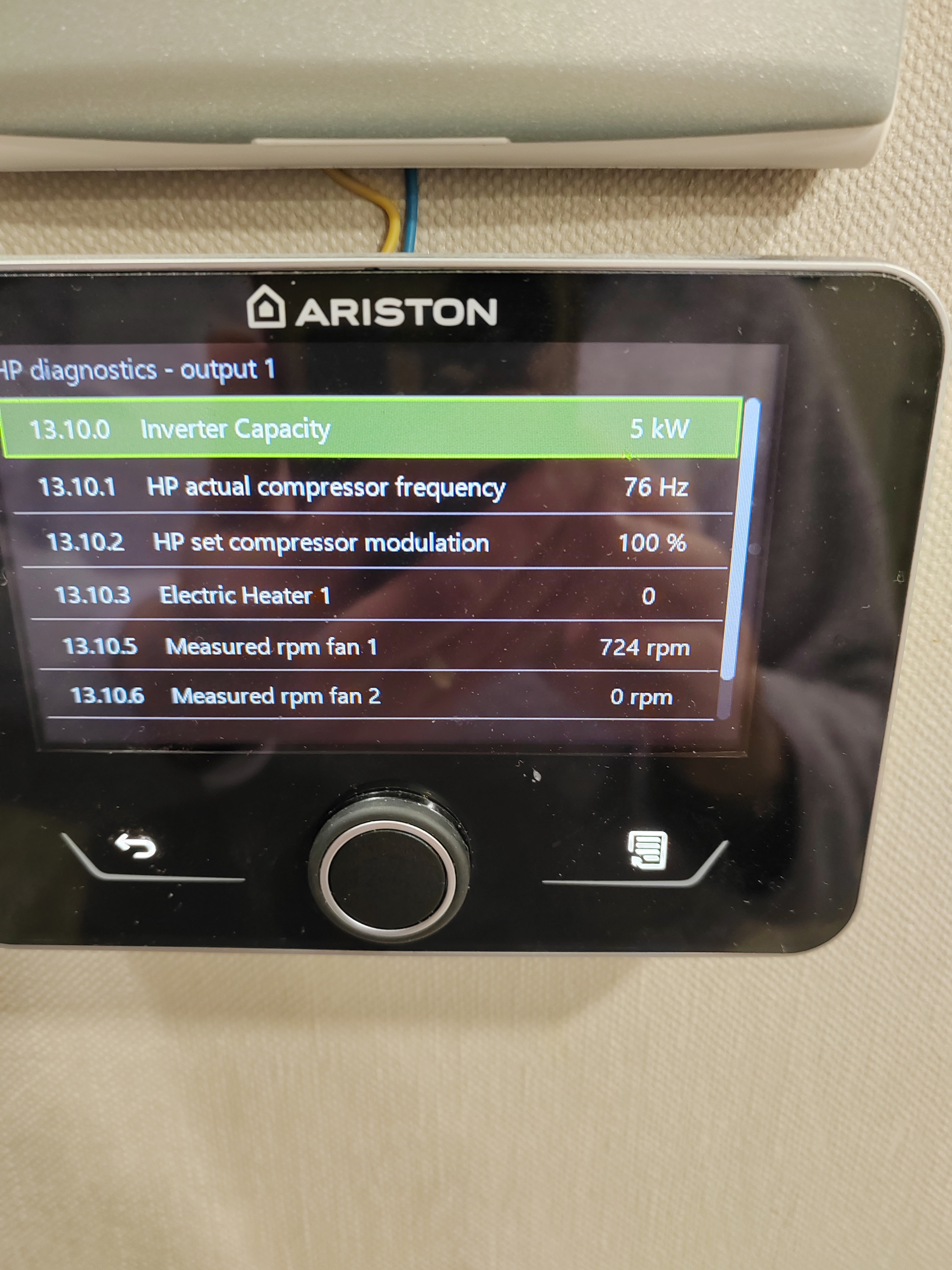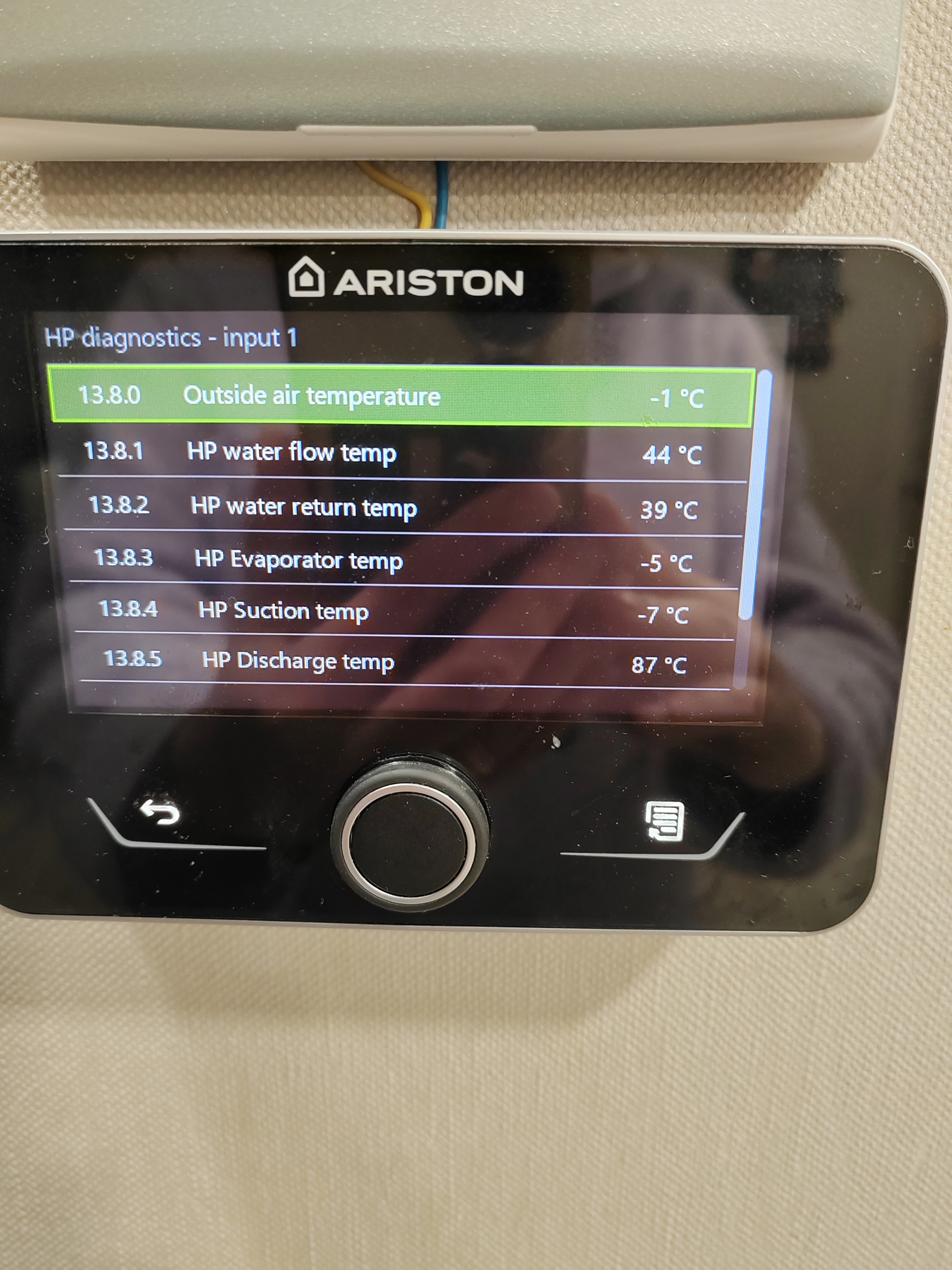 Vesi peale 44 C, tagasi 39 C, vooluhulk minutis 16 l/ min, chat GPT andis võimsuseks 5,6 kW ehk seade töötas sisuliselt täisvõimsusel. Selle juures pumba gaasisosa väljundis oli 87 C.