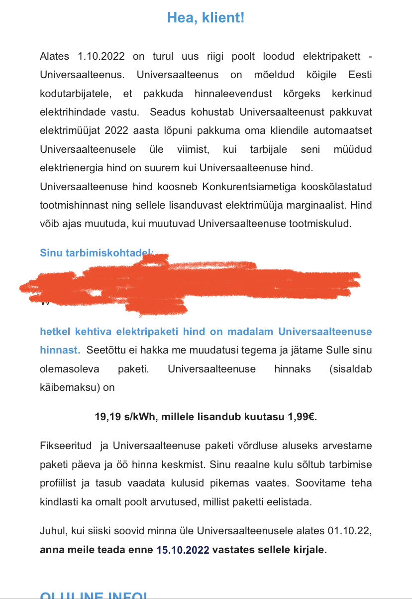 Jutt oli sellest, et viiakse siis kui praegune pakett on odavam. Kahtlustan, et kurjad elektrimüüjad püüavad viia ka neile, kel varasem pakett on odavam.new1 kirjutas: 02 Okt 2022, 19:59 Mul on fix pakett ja nõks alla selle universaalteenuse hinna. Saan aru et automaatselt viiakse kallima hinnaga olevad universaalile üle, ent kui see üle viimine peaks juhtuma, siis peaks mulle meilile mingi teavitus sellest ikka tulema? Poleks esimene kord, kui mingi segaduse tõttu kallim lahendus automaatselt pähe määritakse.