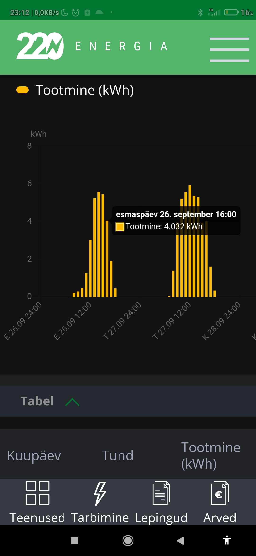 220Energia äpis näitas varem tarbimisel tundide kaupa kWh börsihinda, sellel tunnil tarbitud kogust kWh ja sellel tunnil tarbitud summat rahaliselt.Alexy kirjutas: 07 Okt 2022, 16:40 Üks tagasihoidlik küsimus erivate müüjate äpi kasutajatele: kas mõnes äpis näeb lisaks kogusele ja jooksvalt hinda?(ehk siis jooksva kuu kogus ja hind, mitte tunnid ööpäeva lõikes eraldi) Eesti energial seda pole, seega huvitavad teised "vahendajad" ning just nutikas jooksvad asjad. Miks ma ise ei vaata-puudub võimalus isiku tuvastamiseks nutikas.
