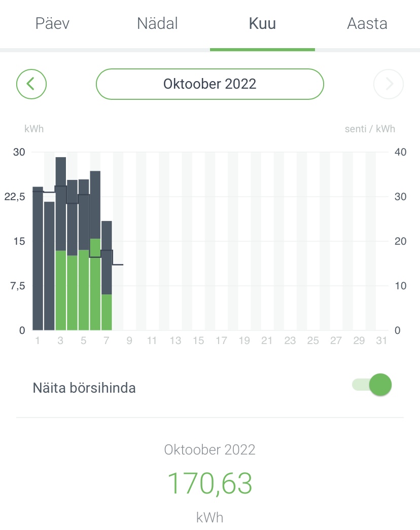 See on ju jooksva kuu kogus koos hinnaga EE äpis?Alexy kirjutas: 07 Okt 2022, 16:40näeb lisaks kogusele ja jooksvalt hinda ... jooksva kuu kogus ja hind ... Eesti energial seda pole