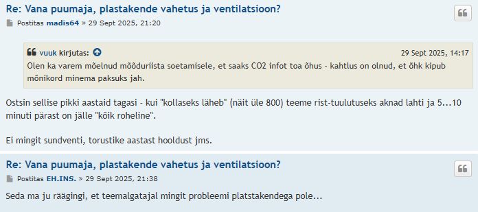 Mõõtetulemust saab reaalset objekti mõõtes. Siin teemas on tehtud mõõtmisi ja mõõtetulemusi koos objektide kirjeldustega teistele mitmel korral tutvustatud. Palusin ka Sinul oma kogemusi tutvustada. Aga Sul järelikult ei ole mõõdetud CO2 numbritega ehk siis objektiivse reaalsusega vanades elumajades mitte mingisugust kokkupuudet olnud.