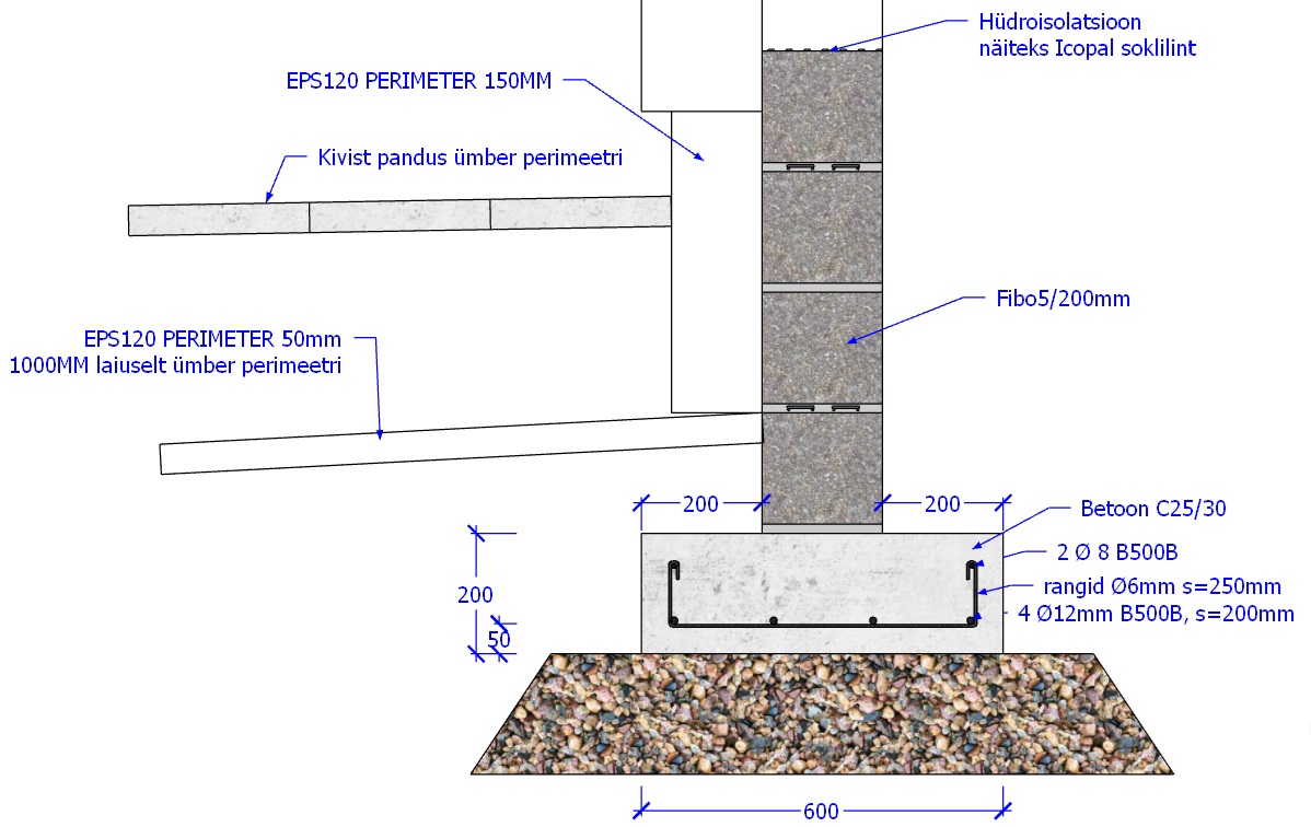 Sellel katusekorrusega elamul mäletatavasti mingit korralikku vundamendi inseneriprojekti ei olnud. Sai tehtud omaenda vaistu järgi. Taldmiku laiuseks 400mm. Üles seina peale sai tehtud igaks juhuks ka armeeritud betoonvöö.