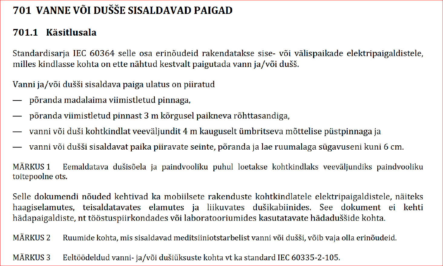 Kui on vann, duss või nendega seotud isiklikuks/ inimkeha pesemiseks mõeldud kraanid või anumad, siis neist arvestades on ohutsoonid ja ruumi nimetus ei oma tähtsust. See standard ei kehti koduse köögi kraanide kohta.