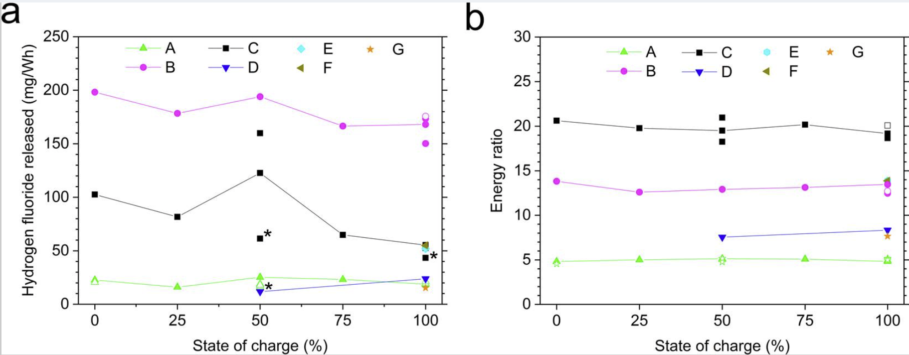 Vasakpoolsel graafikul on põlevast akust eralduva mürgise vesinikfluoriidi kogus sõltuvalt SOC-st erinevate akutüüpide korral.