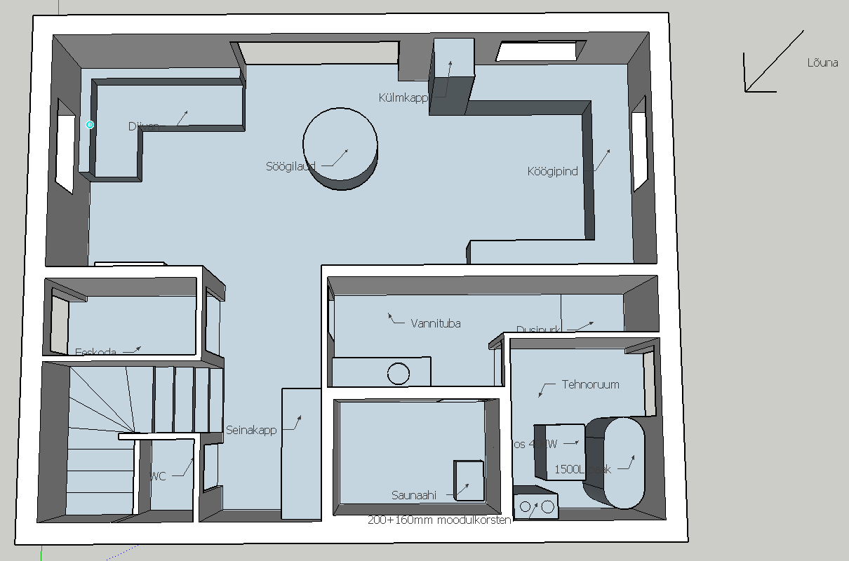 Köögi pind on tõesti suur, eks naise soovid mängus. Juba on plaanis köök L kujuliseks teha ning söögilaud sellesse osasse viia. See küll diivanit suuremaks ei tee, aga jätab vaba ruumi nn. elutoa ja köögi vahele. Samuti on idee üks nurk sealt varastada katlamaja/dusinurga poole. Hea idee! Kuna kandev sein, siis esialgu selle välistasin, kuid ilmselt lühikeste sillete puhul ei tohiks olla probleemi.