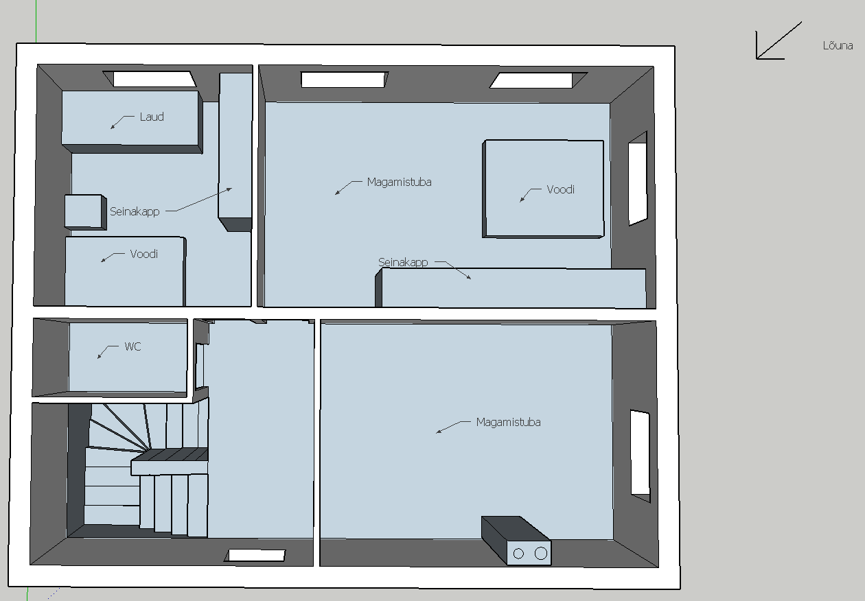 Tänud kaasa mõtlemast! Päris lõuna osas ei ole avaust, küll aga on 3m lai ja 2.1m kõrge avaus maja seina keskel mis vaatab kagu suunas (kohe söögilaua ääres). Vannitoas akent hetkel ei saanud, just sellepärast, et ta asukoht on nii nagu on. Nõustun, et soolikas. Sellepärast peab ehk kogu asetuse ümber vaatama. Teise korruse magamistoa suuruse tingis jah kandev sein ja trepikoda jms. Iseenesest asetasin just väiksesse tuppa kõik asjad mis seal olema peaks ning teoorias mahtusid ära küll.ccc34 kirjutas:Esmalt kiitused, et plaani jagad. Tavaliselt kui inimene midagi omaette tegema hakkab siis jääb ta oma mõtetega teatud asjadesse kinni. Kõrvalseisja pilk on tihtilugu abiks.
