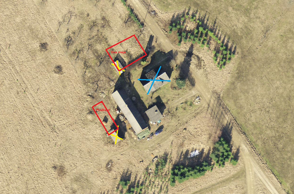 Punasega märgitud uus puukuur ja uue maja potentsiaalne asukoht. Kahekordne maja väiksema aluspinnaga oleks mõistlikum, sest siis jää kõrvalhoone nii tugevalt vaadet varjama.