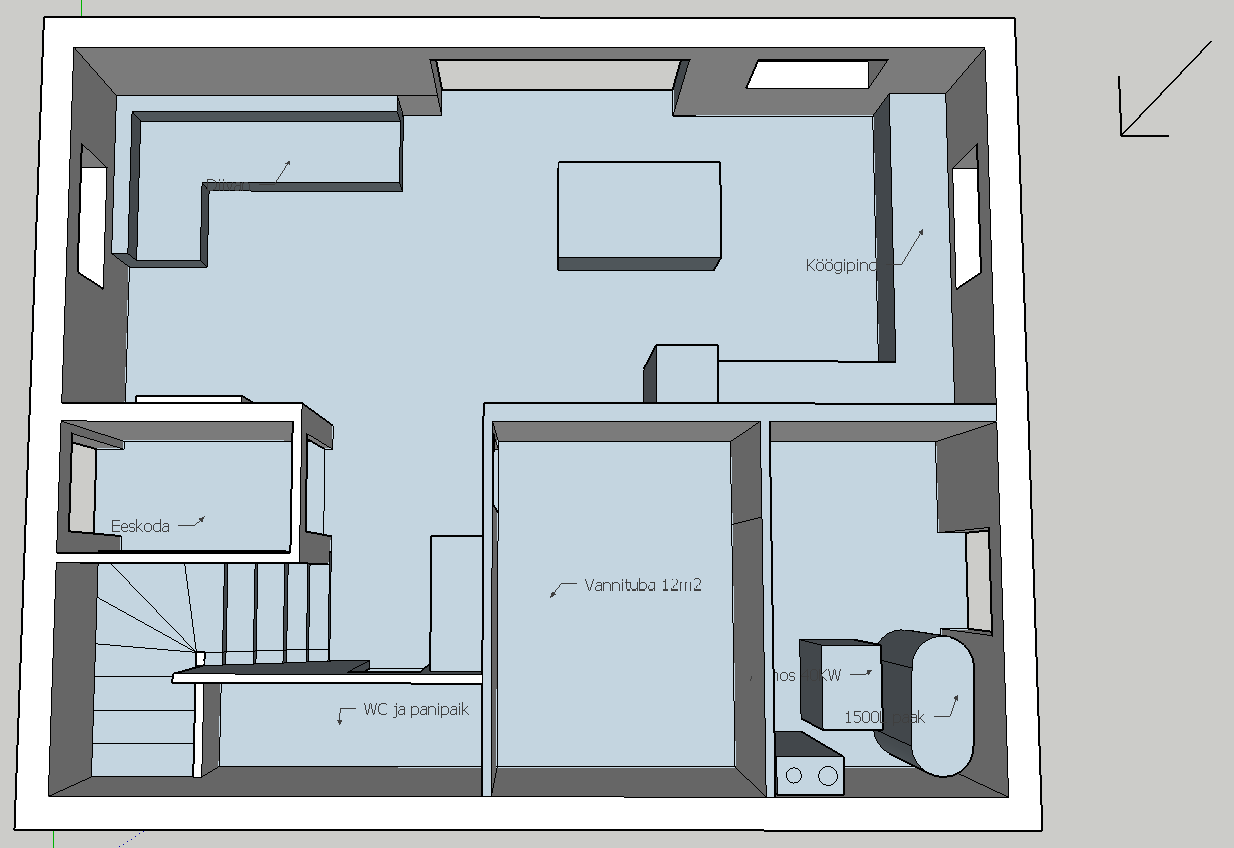 Igasugune konstruktiivne kriitika on teretulnud miks midagi teisiti võiks teha. Maja asetust lõuna suuna suhtes ei saa muuta, ning küljepeal sisenemine on samuti soositud asukohas. Kui keegi täpsemalt kaasa tahab rääkida, siis võin üles laadida ka SketchUp faili.
