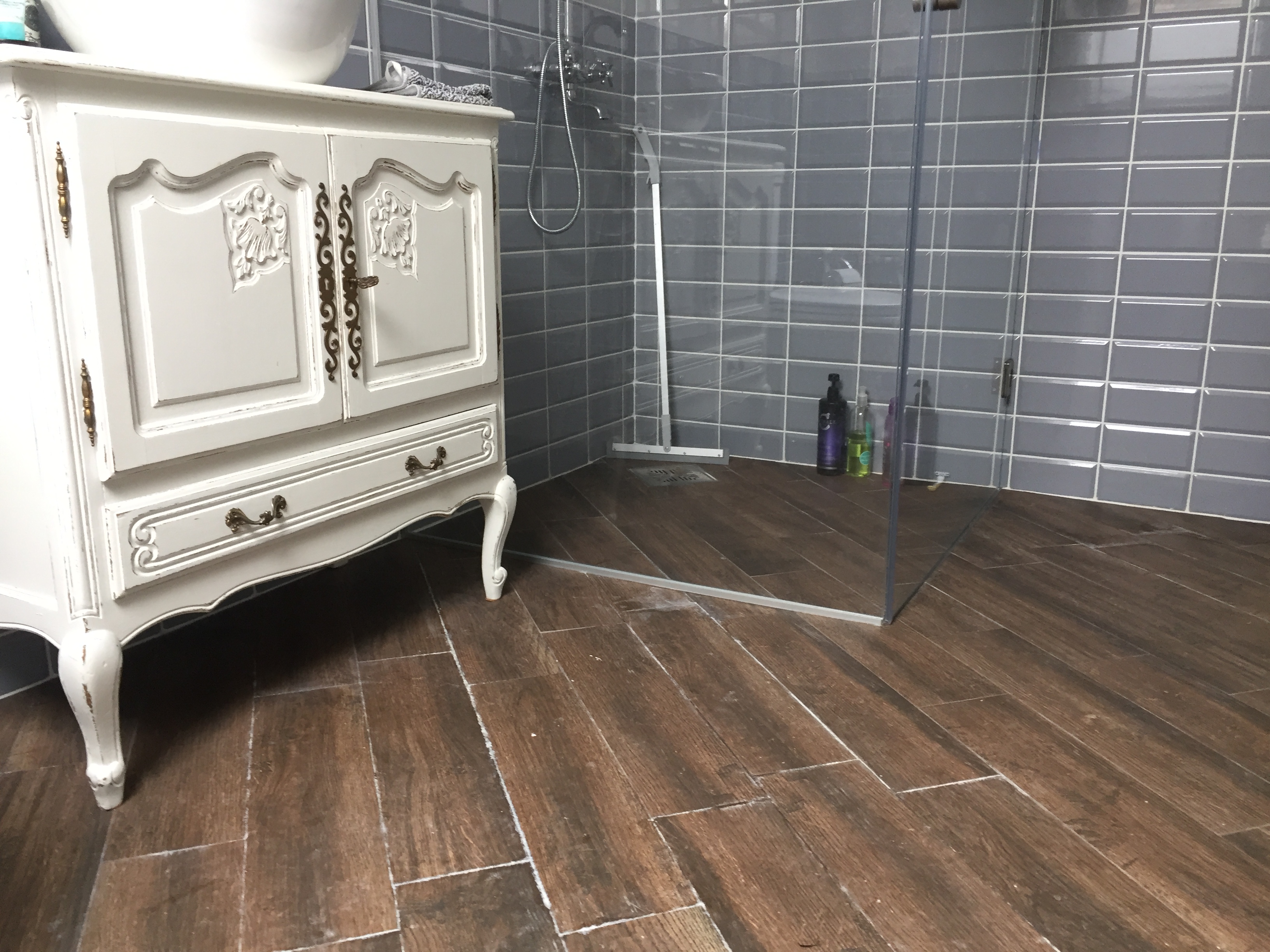 Mul ka suurem osa duširuumi praktiliselt ilma kaldeta, väike kalle ainult trapi ümbruses, vahel lapselapsed ujutavad põranda ikka korralikult üle tükiks ajaks ja midagi ei mullita kuskilt. Pühin harjaga vee trapi poole tagasi ja korras.