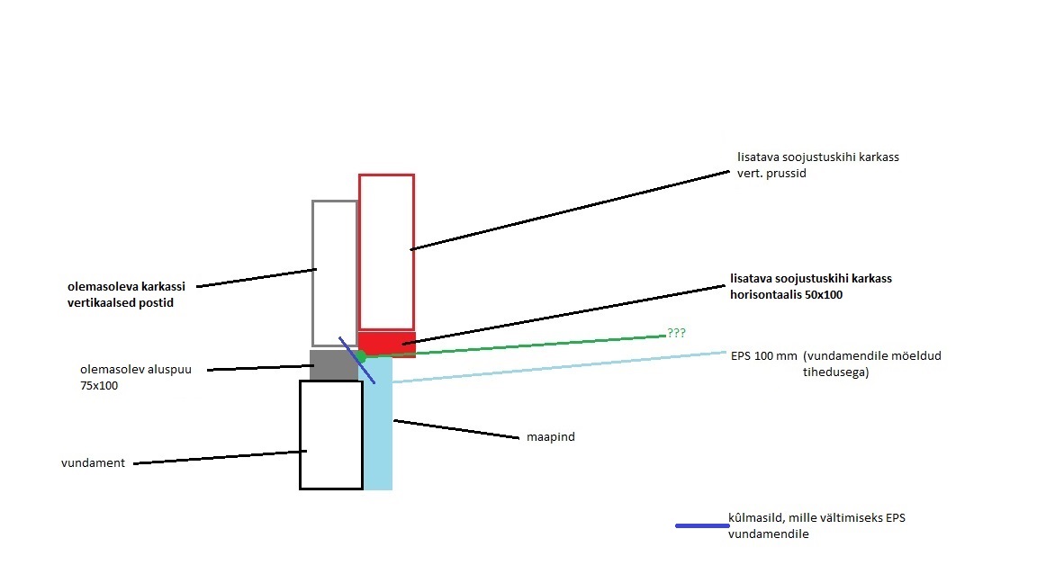 Plaan: Soojustuse jaoks lisatava konstruktsiooni alusprussi kinnitaks olemasoleva aluspuu poolele körgusele vöi körgemalegi (joonisel siis roheli´selt tähistatud tasapinda), vöidaks uue puitosa körgusesse maapinnast vähemalt 5 cm, kui mitte rohkem, asi seegi. Tekkiva kûlmasilla töttu kataks sokli ja katmata jääva aluspuu EPSiga, siit aga küsimus- kas selliselt jätkuvalt madalale jääva aga nüüd ka ühelt poolt EPSiga kaetuna ei hakka ikkagi niiskus olemasolevat aluspuud kahjustama? (just EPSiga katmise töttu niiskuse väljakuivamine ehk halveneb). Alumised puitosad töötleb rohelise immutusvahendiga niiehknaa. (Vöi kas vöiks uue aluspuu körgemalegi panna- olemasoleva ûlaserv- uue alumine serv vastakuti?) Paremaks arusaamiseks joonis.
