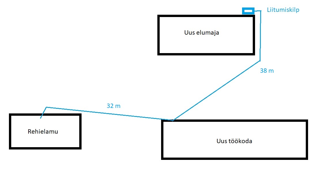 Aitäh vastajatele! Siin ka joonis ligikaudsete kaablipikkustega hoonete vahel. Kusjuures uue elumaja ja töökoja vahele on aastate eest veetud üks neljasooneline kaabel, mille parameetreid ma kahjuks ei tea. Seda pole seni kasutusele võetud.Cass kirjutas: 29 Juun 2020, 00:30 Täienda joonist ka vahemaadega ning mis seadmed (ja nende võimsused) mõlemas hoones olema hakkavad.