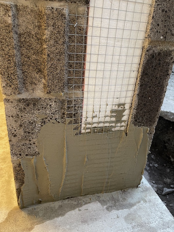 Oma tarkusest klammerdasin riba kanala ehitusest üle jäänud tsingitud võrku Fibo külge, teise poole traadid painutasin 90 kraadi nurga alla ja torkasin lihtsalt peno ja fibo vahele. Selle peale läks fiiberkiuga armeerimissegu Webertherm 310 ja loodan et väga puusse ei pannud selle konstruktsiooniga.
