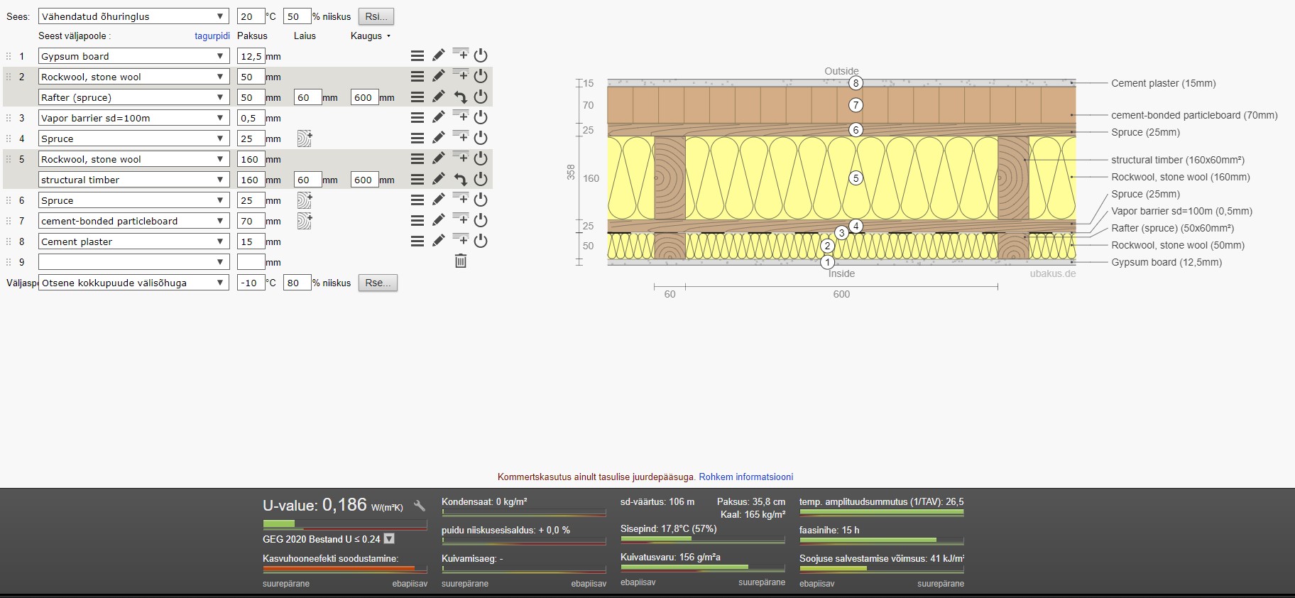 Tegin mingi seina kokku- tep-plaadi andmeid hetkel ei tea, muidu sisestaks selle täpsemalt, valisin sealt nimekirjast mingi tsementplaadi, aga see pole päris see. Aurutõkkeks on väärtusega sp 100, teised alla selle tekitasid kastepunkti tep.plaadi all olevasse laudisesse (nr6). Kui tep minema visata ja tuuletõke pluss laudis, siis läks oluliselt paremaks. Uurin edasi. Hetkel on sisemise laudise peal papp ja tapeet ning villa asemel termoliit.