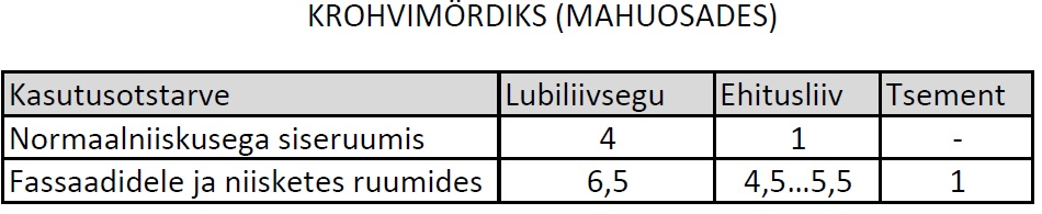 https://espak.ee/epood/toode/lubiliivse ... kaat-40kg/ Lubiliiva kotil õpetus variantidena peal olemas, aga soklile teeksin tunde järgi (olenevalt ka liiva omadustest) tootjajuhendis olevast fasaadile mõeldud reptsetist veidi kangema, kusjuures lähtuksin ka kasutusmugavusest - täpne vahekord selguks töö käigus.