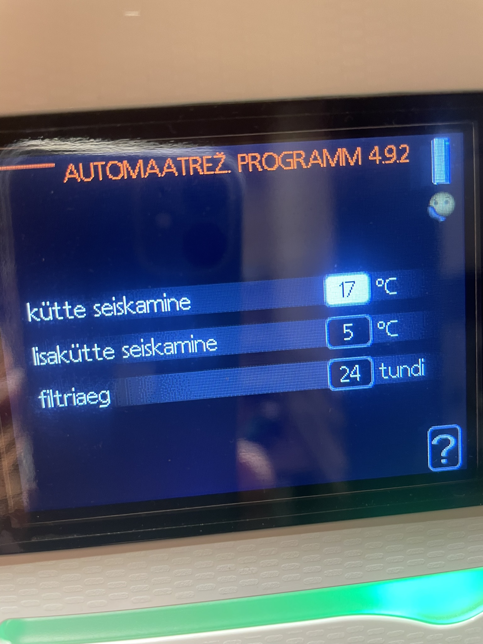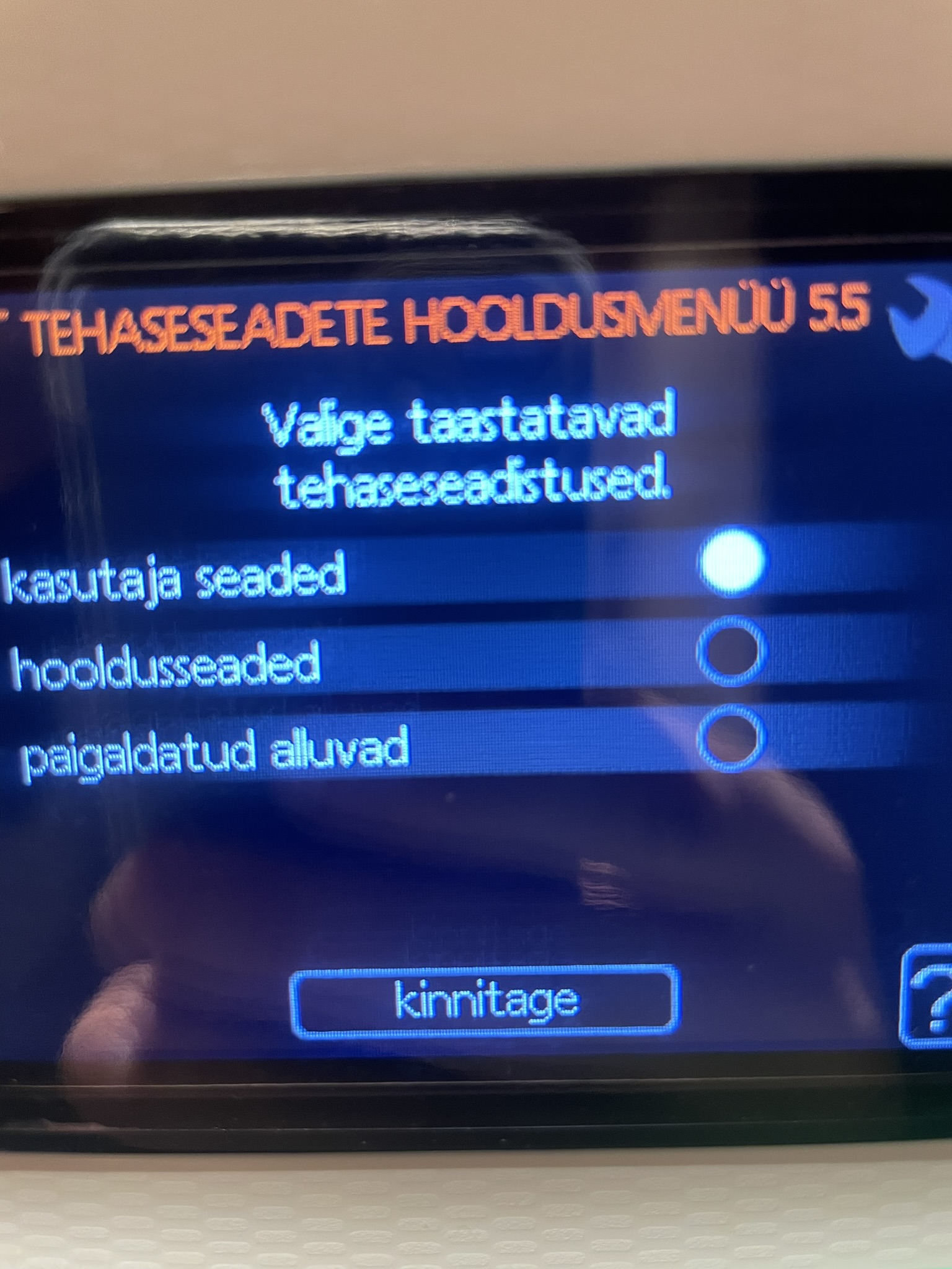 Lõputus menüüdes surfates leidsin vajaliku koha ülesse kus saab tehase seadeid taastada ja siis pakub mulle 3 varianti: Arusaamatu, miks peab küttesüsteemil olema nii palju valikuid, eriti veel seadete taastamiseks. Valisin alguses esimese. Jäi endiselt esimesele astmele tööle aga muutus üllatavalt jõuliseks. 3kw võimsusega tenn sai vee soojendamisega nüüd väga lihtsalt hakkama. Super, minu jaoks oli sellega peamine mure murtud.