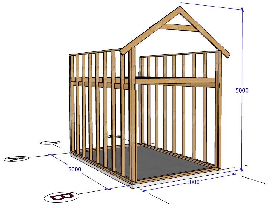 Aga soov ei ole midagi üle mõistuse keerulist - ca 3 meetrit lai ja katuseharja suunal ca 5 meetrit pikk hoone, millel on viilkatus ja sees tühi ruum mille kohal viilkatus, näiteks 10:12 või 8:12 suhtega. Kindlasti alla 20 ruudu kogupindala ja seal kohas kus planeerin seda püstitada, mingeid lube pole vaja. Ruumis on osaliselt, mingi 1-2 meetri osas "teine korrus" kuhu asju saab ladustada, see peab see mingite talade otsas olema ja piisavalt kõrgel näiteks 2,2 meetrit talade alumisest äärest.