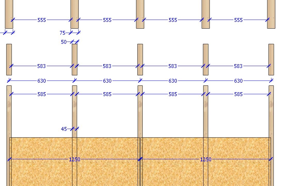 Selgitav joonis: SketchUp-i abil on mulle selgunud, et kõige paremini 1250mm või 625 laiusega OSB-ga sobiv variant on 75mm laiusega talastik või laagid. 75 x 150mm prussid on nii immutatud kui kuivad Puumarketis saadaval.