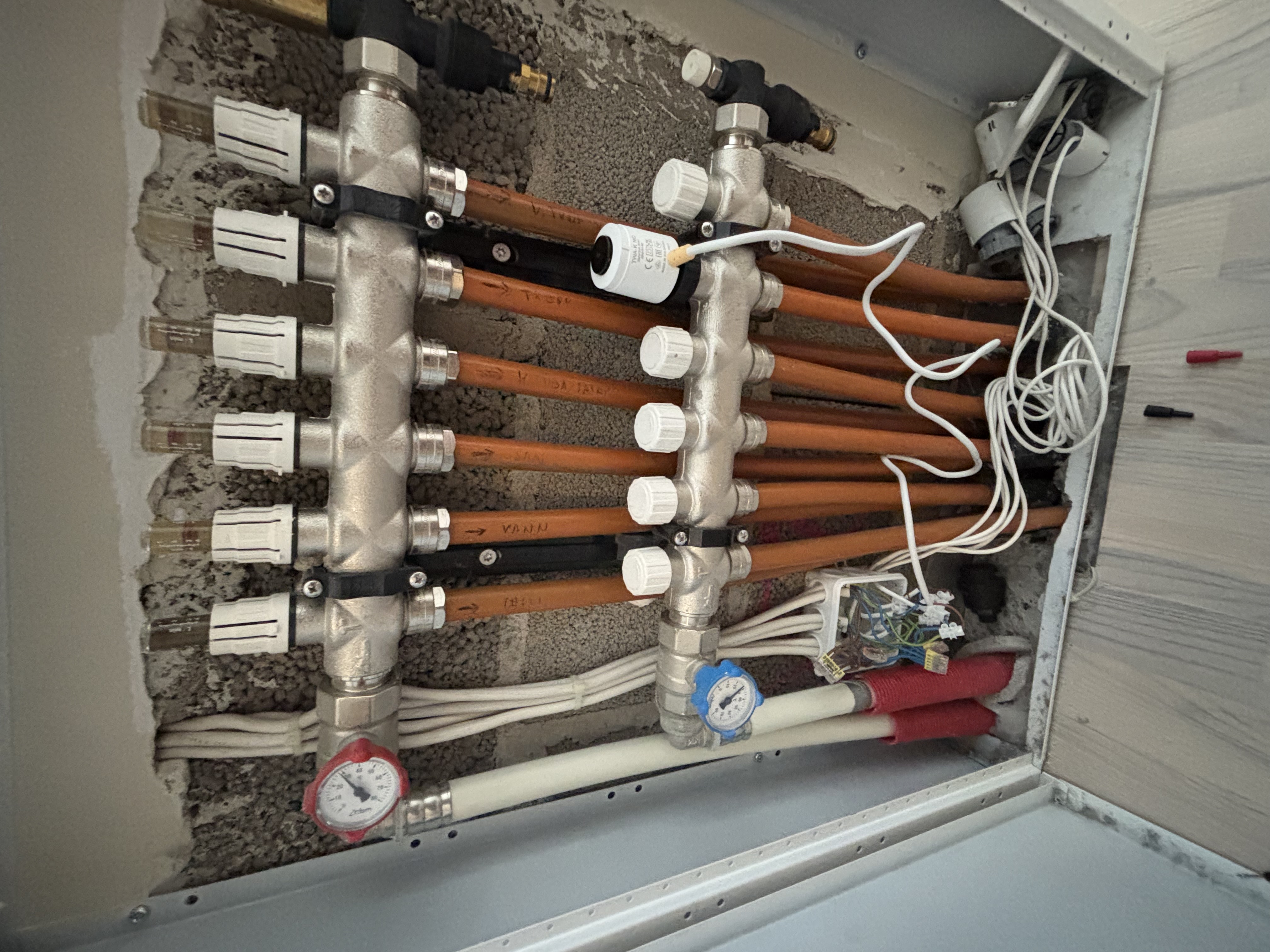 Pole elektrik ega san mees, niiet kui midagi seletuses pole oige, andke andeks 🙃 hakkas sellega pihta, et maakütte katel hakkas kütma, paar minti ja lõpetas, kuna tema jaoks tempid olemas süsteemis. Mina aga tunnen kuidas põrandad iga päevaga jahedamaks muutuvad, kuniks garaaz oli hommikul sama külm kui väljas. Kuna pump töotas, aga süsteemi ei liikunud hakkasin vaatama kollektori poole. Koik ujukid üleval ja voolavust pole. Keerasin maha, nõelad liiguvad ja kui vajutada, siis ujuk kohe reageeris, järelikult kinni pole. Nii, edasi vaatasin elektrivoolud. 220 tuleb harutoosi, seal liigub 3 soonelise pruuniga seina peal olevasse termostaati, tuleb signaaliga kol/roh tagasi ajami peale. Peal olevad ajamid mingi fiv italy. Eile mõõtsin, siis termostaadilt tuli kohe kui peale tempi keerata signaal ajamile. Vanad ajamid 10tk, mitte ükski enam ei tööta. Panin ka otse pistiku, 220 külge, ei midagi. Tõin ühe danfos twa-k testiks, kohe reageeris elektrivooluga ja ujuk liikus. Ehk lülitus ajamil toimus. Täna mõtlesin jätkatateiste kontuuridega.Ei saa enam aru, kas on võimalik et kõik 10ajami läbi läinud?
